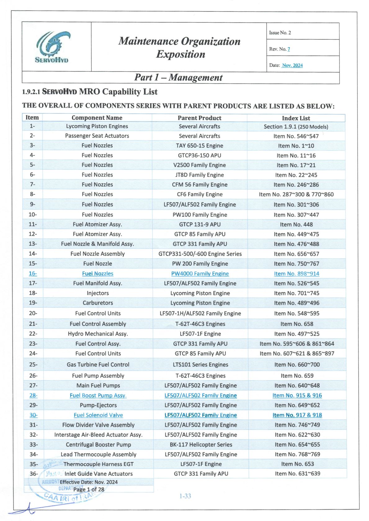 سروهید با استفاده از زیرساختهای پیشرفته، تیم متخصصان مجرب و رعایت استانداردهای بینالمللی خدمات گستردهای در زمینه تعمیرات مجموعهها و متعلقات صنایع مختلف ارائه میدهد. ما در زمینه صنایع هوایی با رعایت الزامات CAA.IR Part-145 و همچنین استانداردهای جهانی خدمات خود را با بالاترین سطح کیفیت و ضمانت انجام میدهیم.